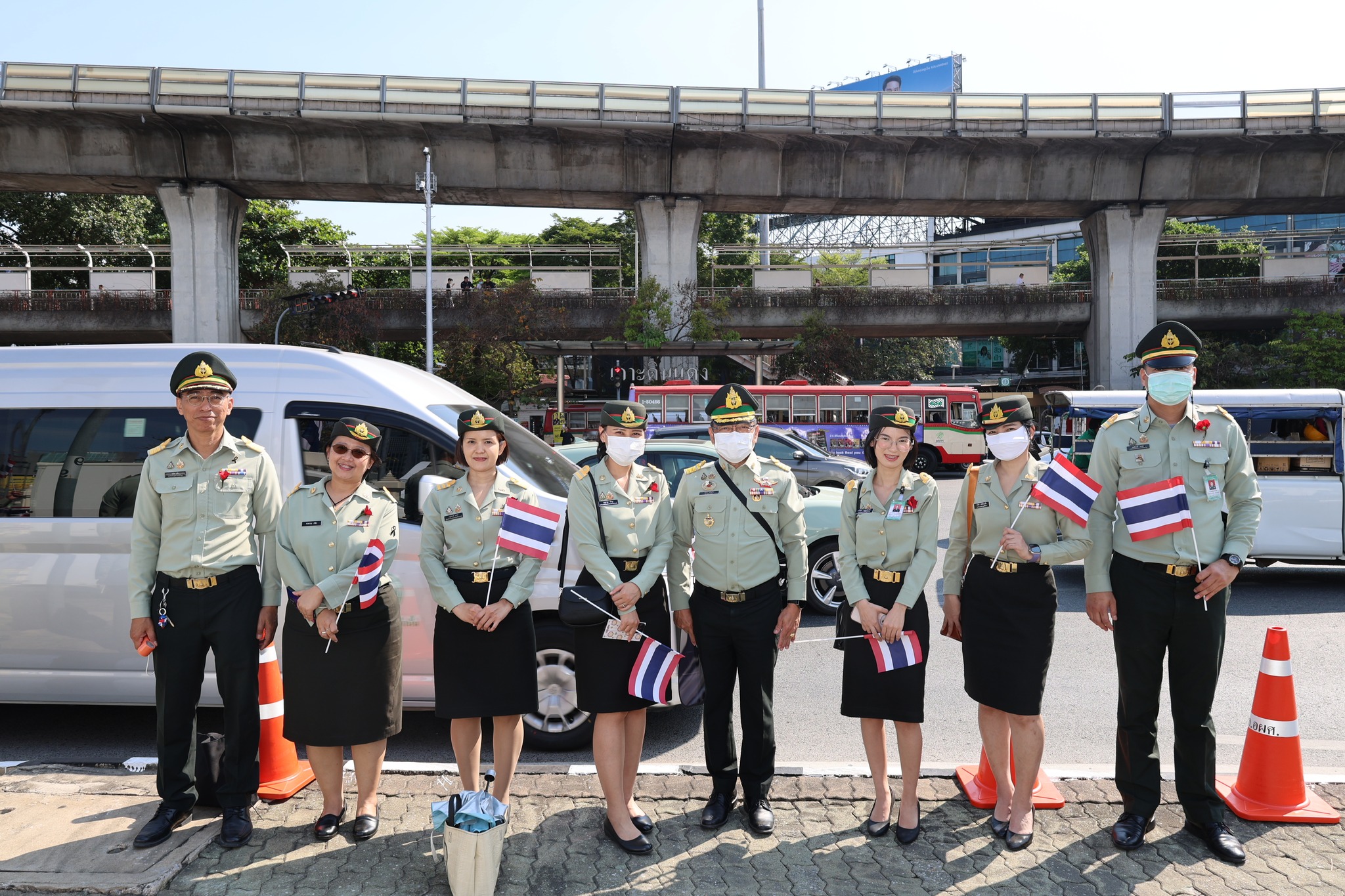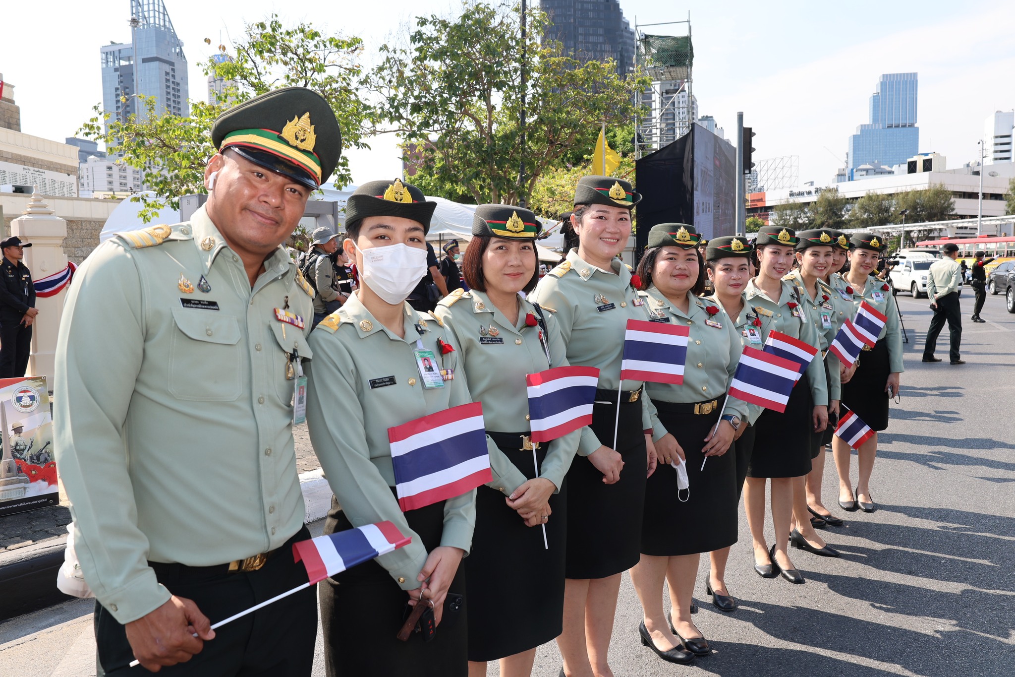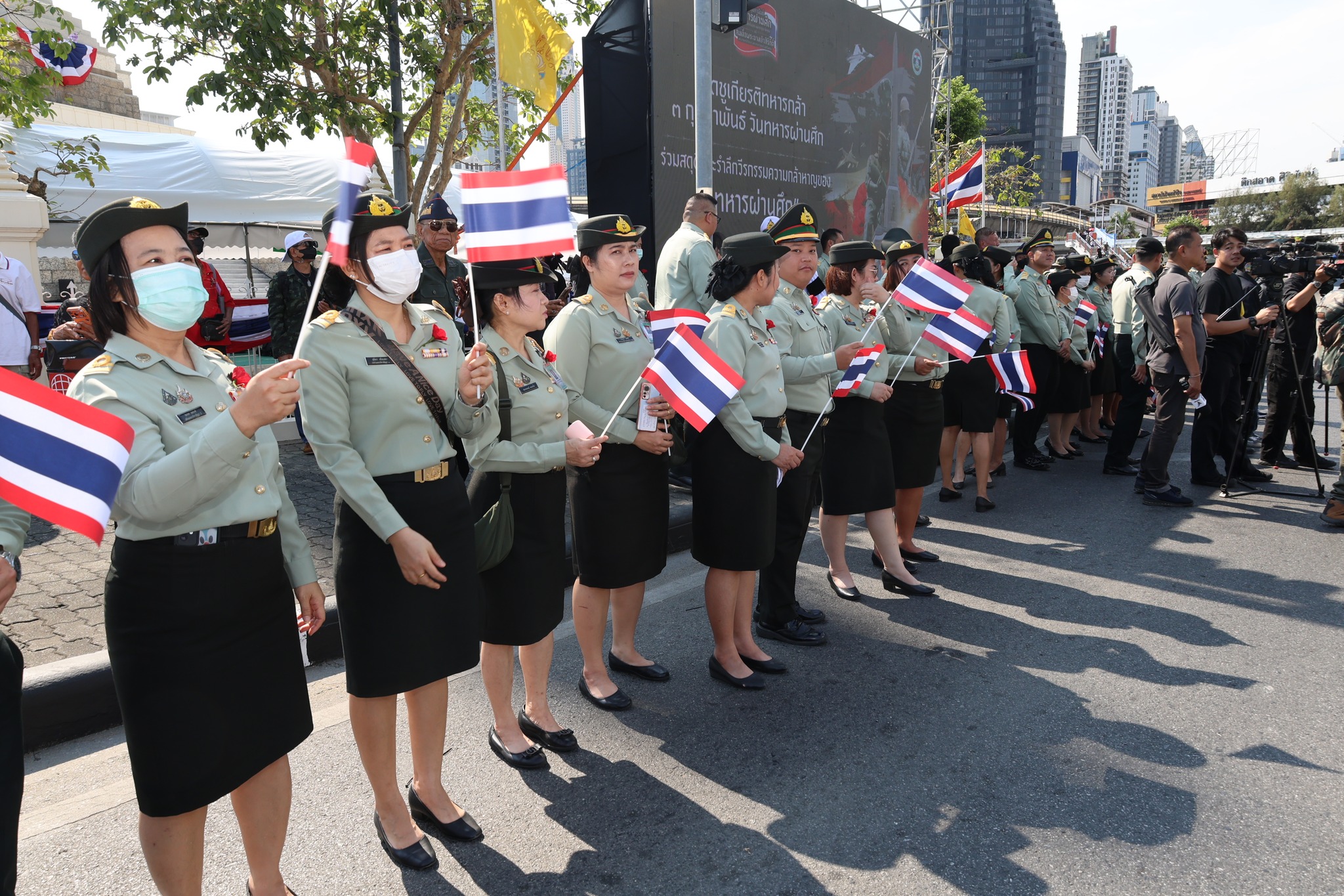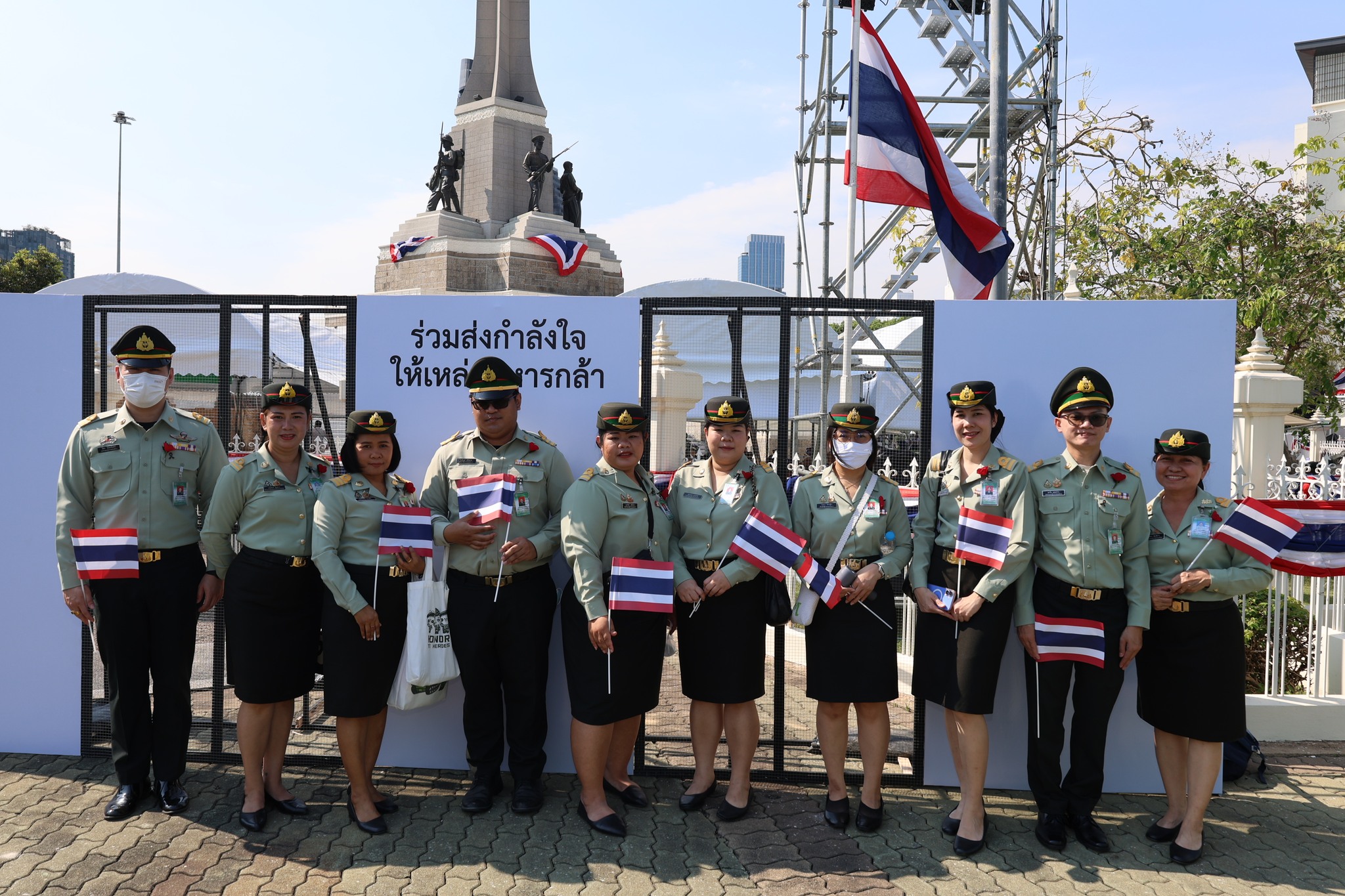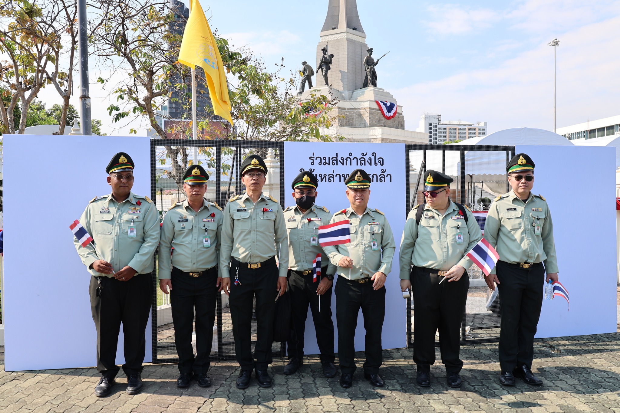 เจ้าหน้าที่ สำนักงานรักษาความปลอดภัย อผศ. เข้าร่วมกิจกรรมโบกธงเพื่อเป็นกำลังใจให้แก่ทหารผ่านศึก ที่เข้าร่วมพิธีเดินขบวนพาเหรด ทั้ง 7 กรณีสงคราม ตลอดเส้นทางการเดินจากองค์การสงเคราะห์ทหารผ่านศึกไปยังอนุสาวรีย์ชัยสมรภูมิ